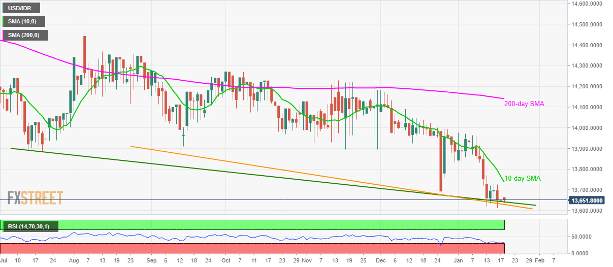 USD/IDR stays above the medium-term trend line supports while trading around 13,650 ahead of the European session on Monday. The pair has been struggling to extend its downpour below multi-month-old support-lines since December 13 wherein oversold conditions of RSI favor a pullback before further declines.