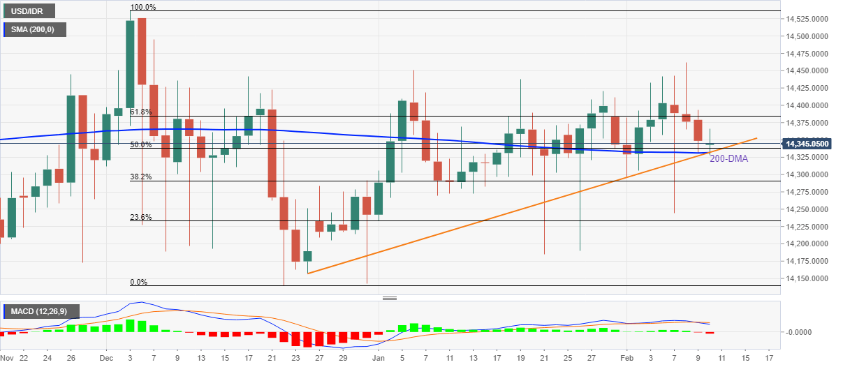 Technically, a convergence of the 200-DMA and an upward sloping trend line from late December restrict the immediate downside of USD/IDR around $14,330.