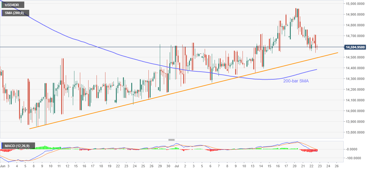 USD/IDR drops 0.80 to 14,593 ahead of the European session on Thursday. The pair defies the previous day’s bounce off 14,558 while flashing a second negative day so far in the week.