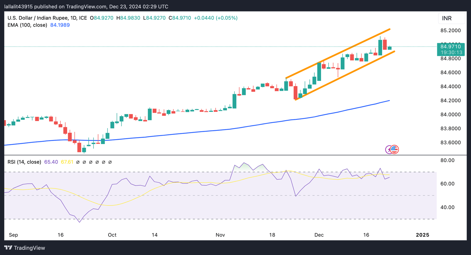 The Indian Rupee trades on a weaker note on the day. The strong uptrend of the USD/INR pair remains intact as the pair holds above the key 100-day Exponential Moving Average (EMA) on the daily timeframe. The path of least resistance is to the upside as the pair, with the 14-day Relative Strength Index (RSI) standing above the midline near 65.40.