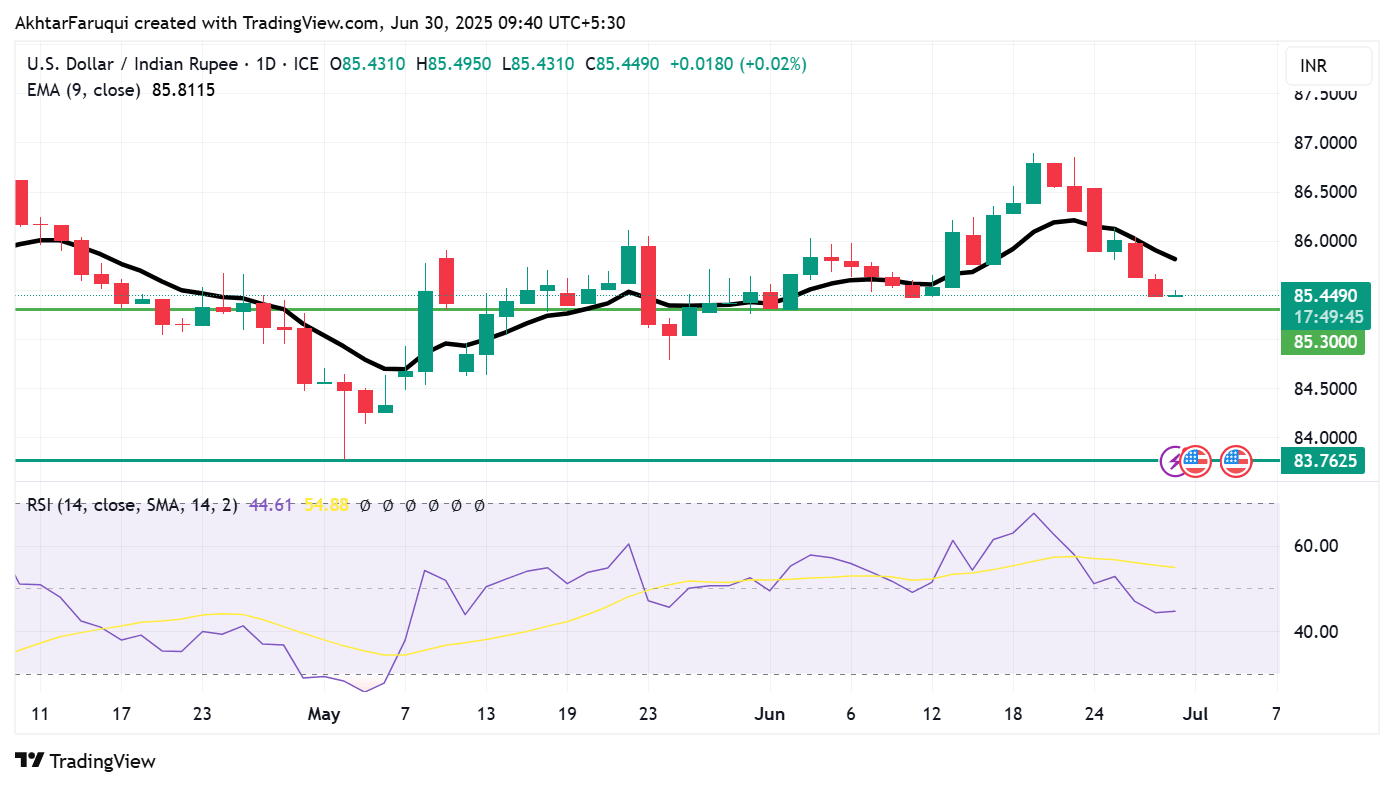 The USD/INR pair holds modest gains near 85.50 on Monday, falling below the nine-day Exponential Moving Average (EMA), suggesting a weaker short-term price momentum.
