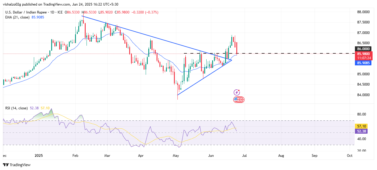 If buyers defend the EMA support, the pair could maintain a mild upward bias. However, a sustained drop below the 85.90–85.70 area might encourage further profit-taking, dragging USD/INR back inside the prior consolidation range.
