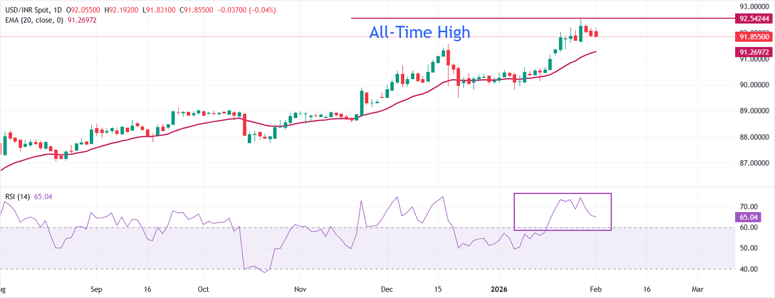 USD/INR trades lower at around 91.8550 at the time of writing. The pair holds firm above the rising 20-day EMA at 91.2697, keeping the short-term uptrend intact. The average continues to ascend, pointing to sustained buying pressure and favoring dips to be bought.