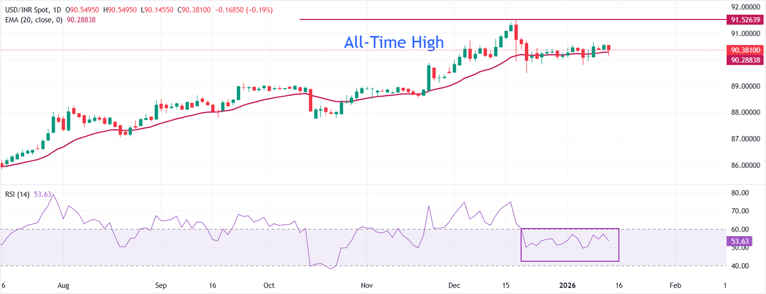 USD/INR trades lower near 90.3810 as of writing. Price holds above the 20-day Exponential Moving Average (EMA) at 90.29, sustaining a short-term upward bias. The 20-day EMA is edging higher, supporting the path of least resistance to the upside.