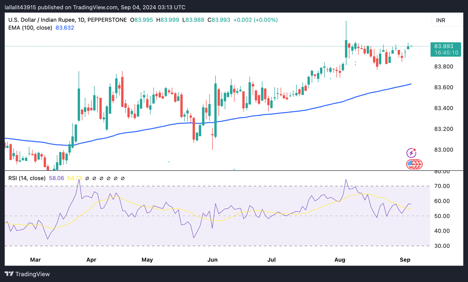The 84.00 psychological figure appears to be a tough nut to crack for USD/INR. A decisive break above this level could pave the way to 84.50.