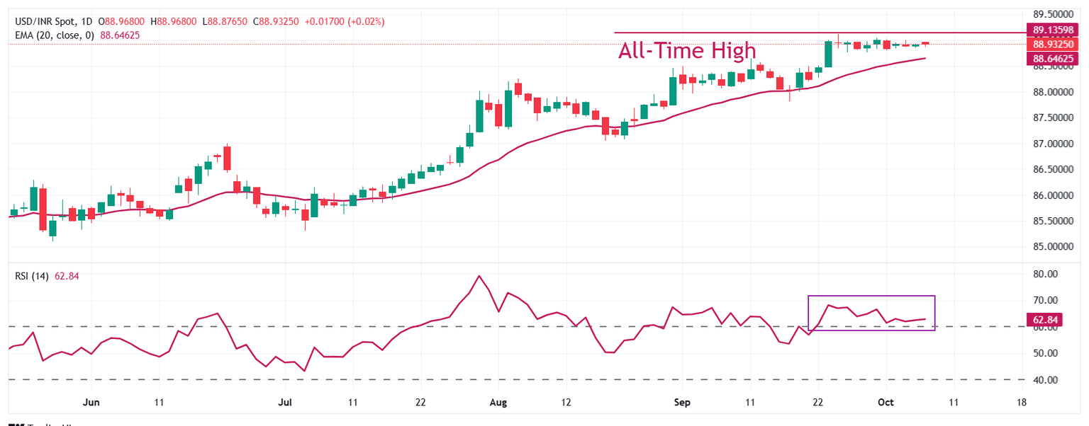 USD/INR stays in a tight range near the all-time high of 89.10 for almost two weeks. The near-term trend of the pair remains bullish as the 20-day Exponential Moving Average (EMA) slopes higher around 88.62.