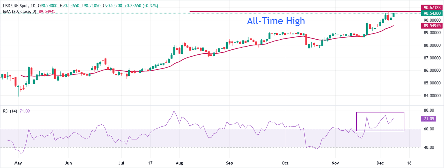 USD/INR trades at 90.50 as of writing. The 20-day Exponential Moving Average (EMA) is rising and the pair holds above it, reinforcing a bullish short-term trend.
