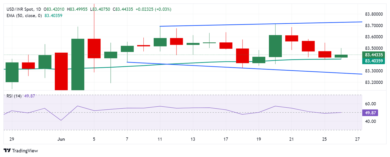The immediate support appears at the 50-day Exponential Moving Average (EMA) at 83.40. A break below this level could exert pressure on the USD/INR pair to navigate the region around the lower boundary of the broadening bottom around the level of 83.30.