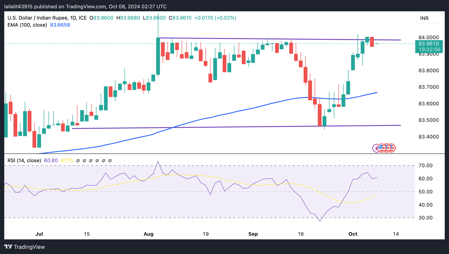 The upper boundary of the rectangle and psychological mark near 84.00 act as a key resistance level for USD/INR. Any follow-through buying above this level could attract some buyers to the all-time high of 84.15, followed by 84.50.