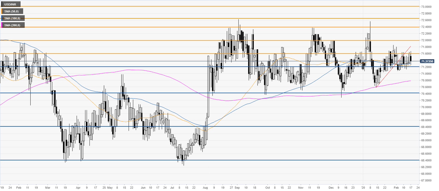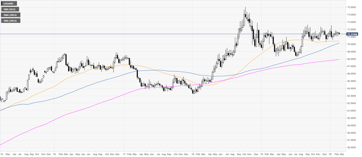 After the 2018 bull-market, USD/INR has been consolidating in a rectangle formation. The quote is trading above its main weekly simple moving averages (SMAs), suggesting a bullish momentum in the long term.