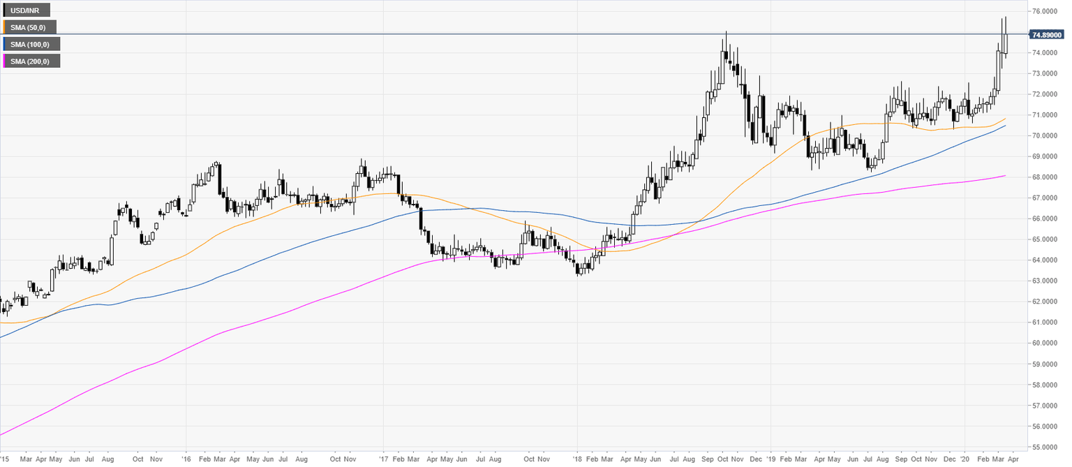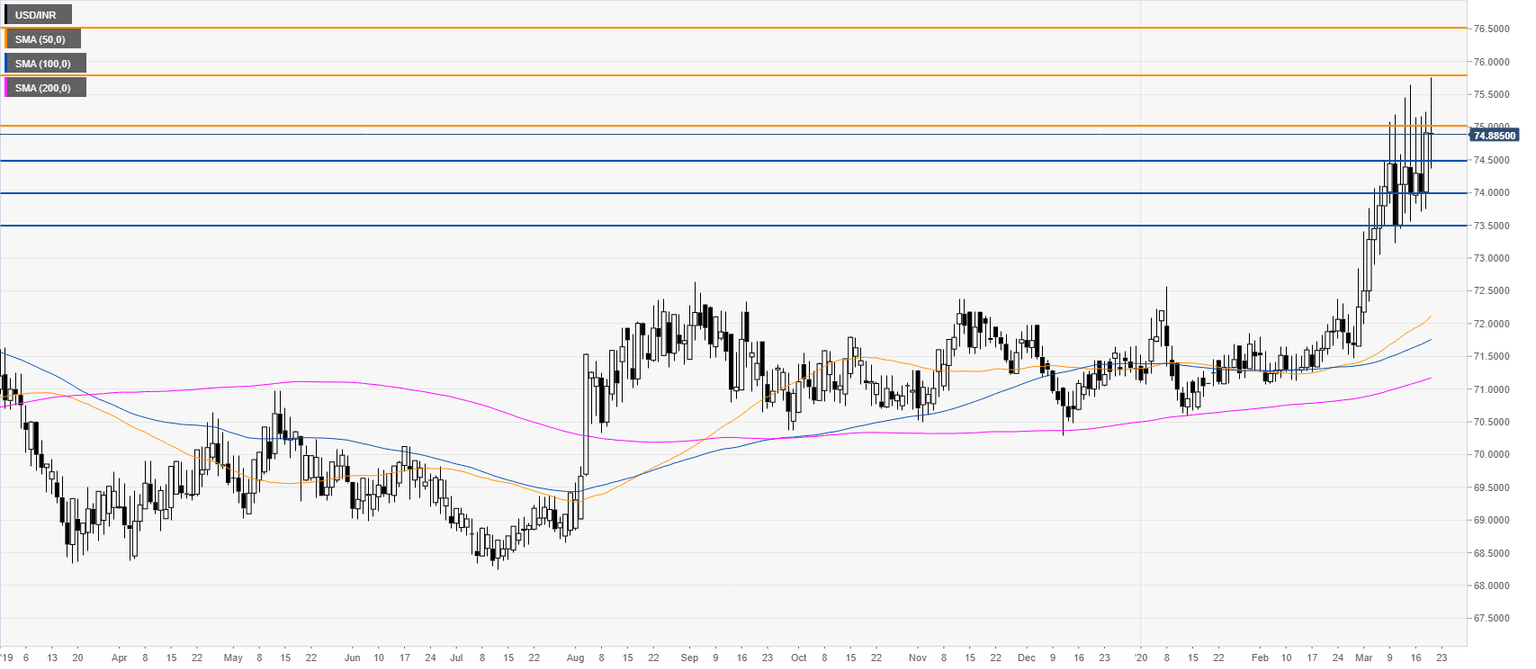 - USD/INR bull trend stays intact as the quote is clinging to three-decades highs.