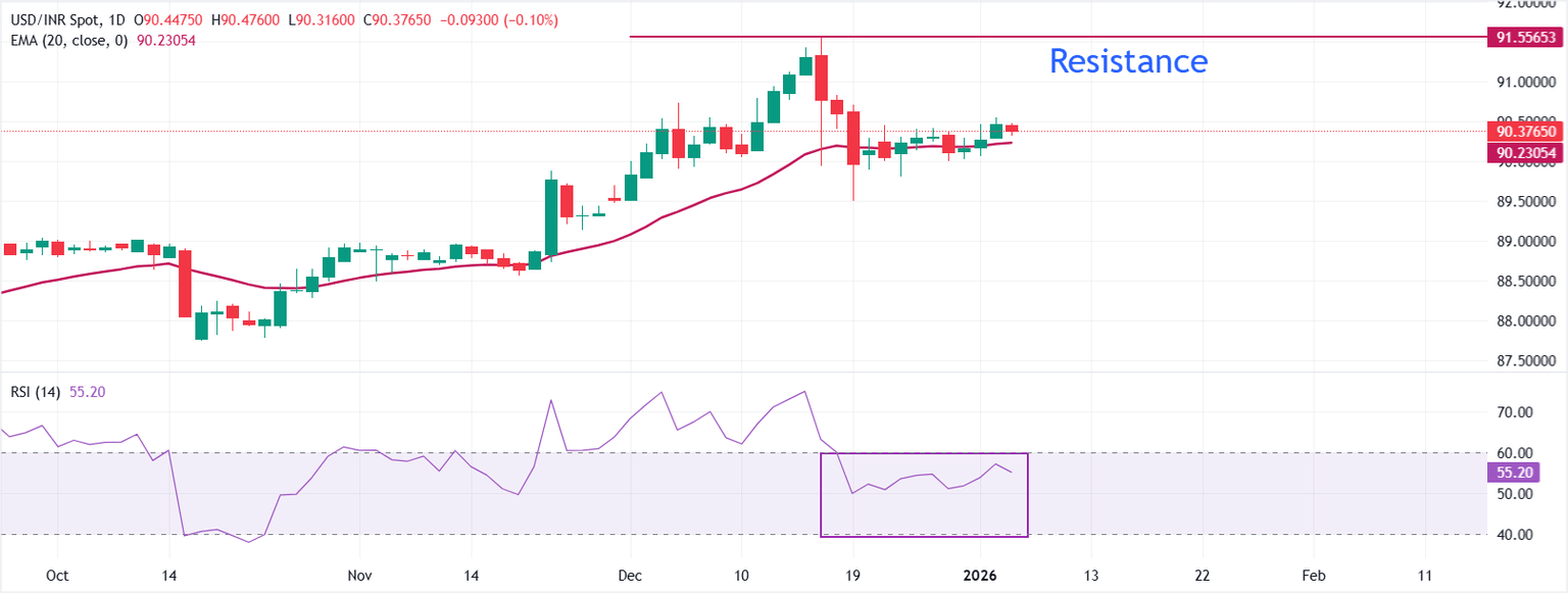 In the daily chart, USD/INR trades at 90.3765. The pair holds above the rising 20-day Exponential Moving Average (EMA at 90.2305, which supports the broader uptrend after the recent pullback. The slope of the average has flattened, yet price action continues to respect it as dynamic support.