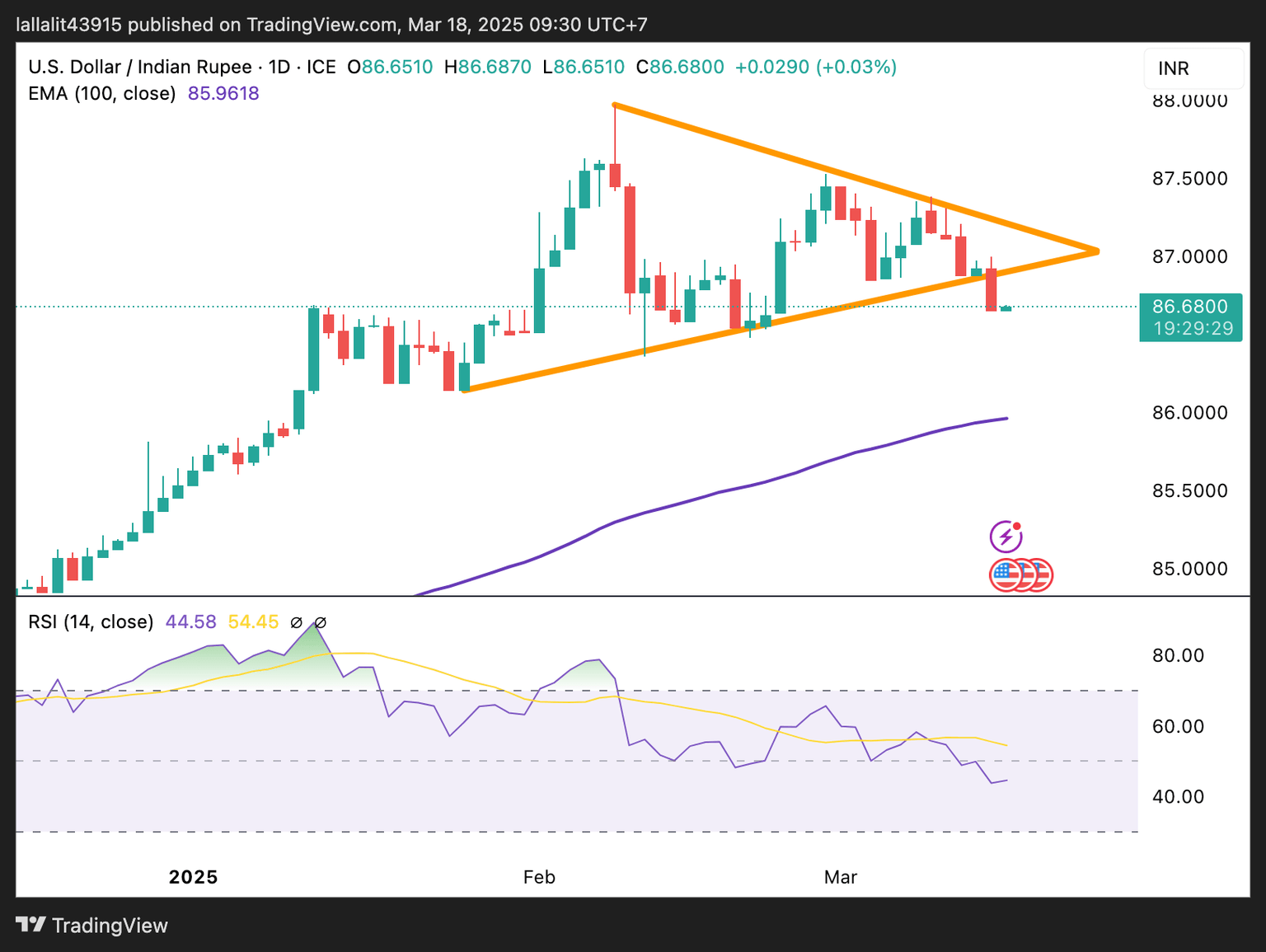 The Indian Rupee trades on a weaker note on the day. The USD/INR pair has broken out of a symmetrical triangle on the daily chart. In the longer term, the uptrend of the pair remains in play, with the price being above the key 100-day Exponential Moving Average (EMA). However, in the near term, further downside looks favorable as the 14-day Relative Strength Index (RSI) stands below the midline near 43.65.