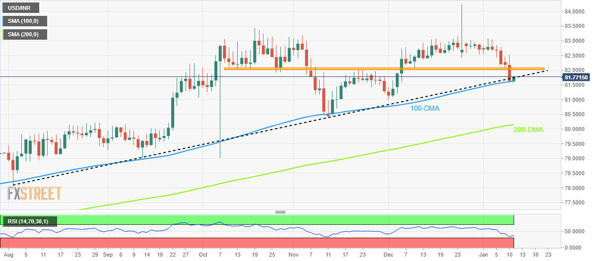 Meanwhile, a daily closing below the 100-DMA level of 81.70 could help the USD/INR sellers to keep the reins.