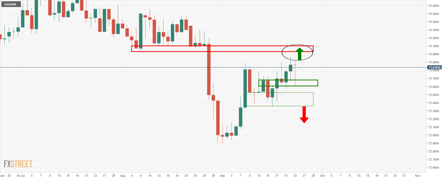 USD/INR has been drifting higher towards the 74 level this week. However, the bears are present and there are chances of a restest of the hourly 21-EMA.