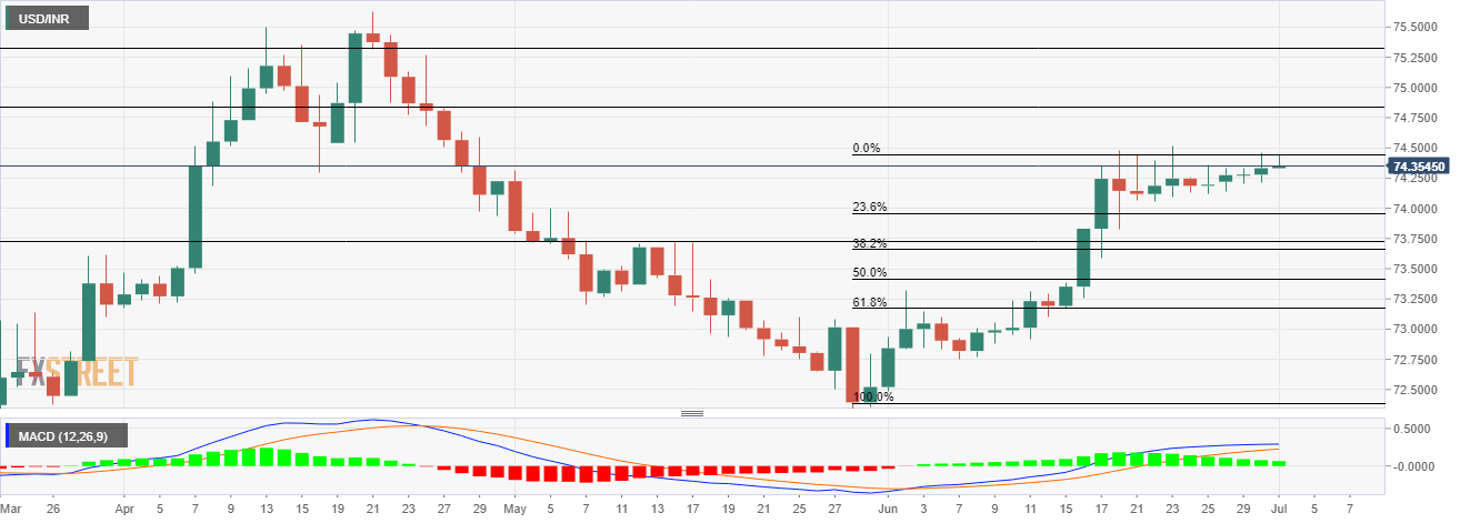 - USD/INR continues with its late May month rally and remains on track to gain above 74.50.