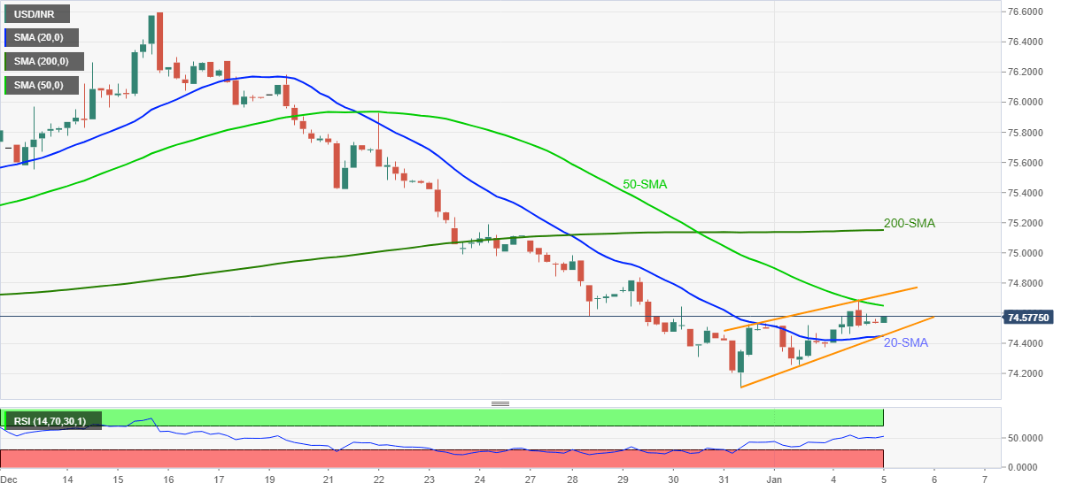 USD/INR seesaws around 74.55-60 during Wednesday’s Asian session, after rising the most in three weeks the previous day. In doing so, the Indian rupee (INR) pair holds onto the recovery moves from the lowest levels since mid-November, flashed on Friday.