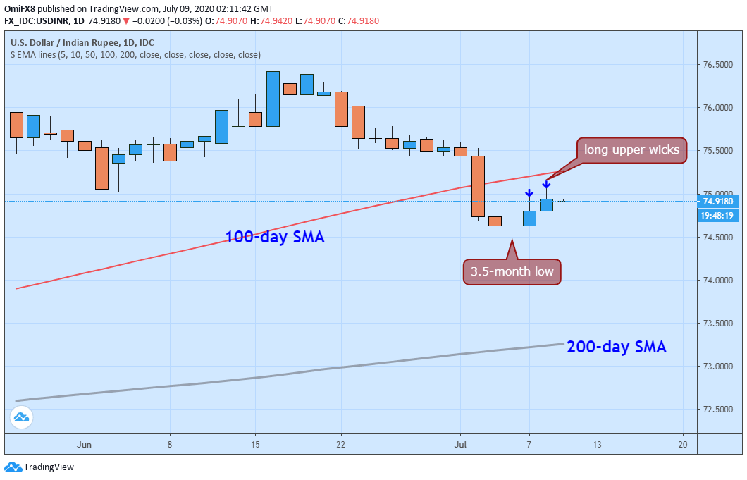 USD/INR rose to 75.00 on Wednesday, having printed a 3.5-month low of 74.5280 on Monday.