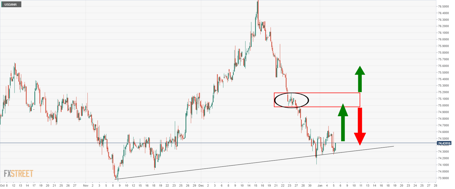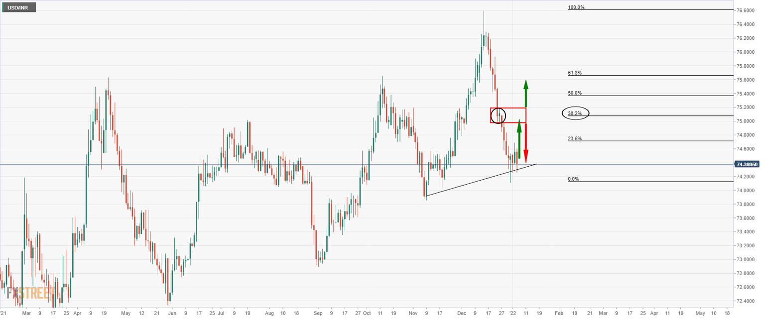 As illustrated above, the price has been accumulating around 74.20/40 and the bulls could be encouraged to move in to clean up some of the imbalance of the recent price run, on a break of 74.60 in the coming days. The bulls could aim as far up as the 38.2% Fibonacci retracement area on the daily chart near 75.10: