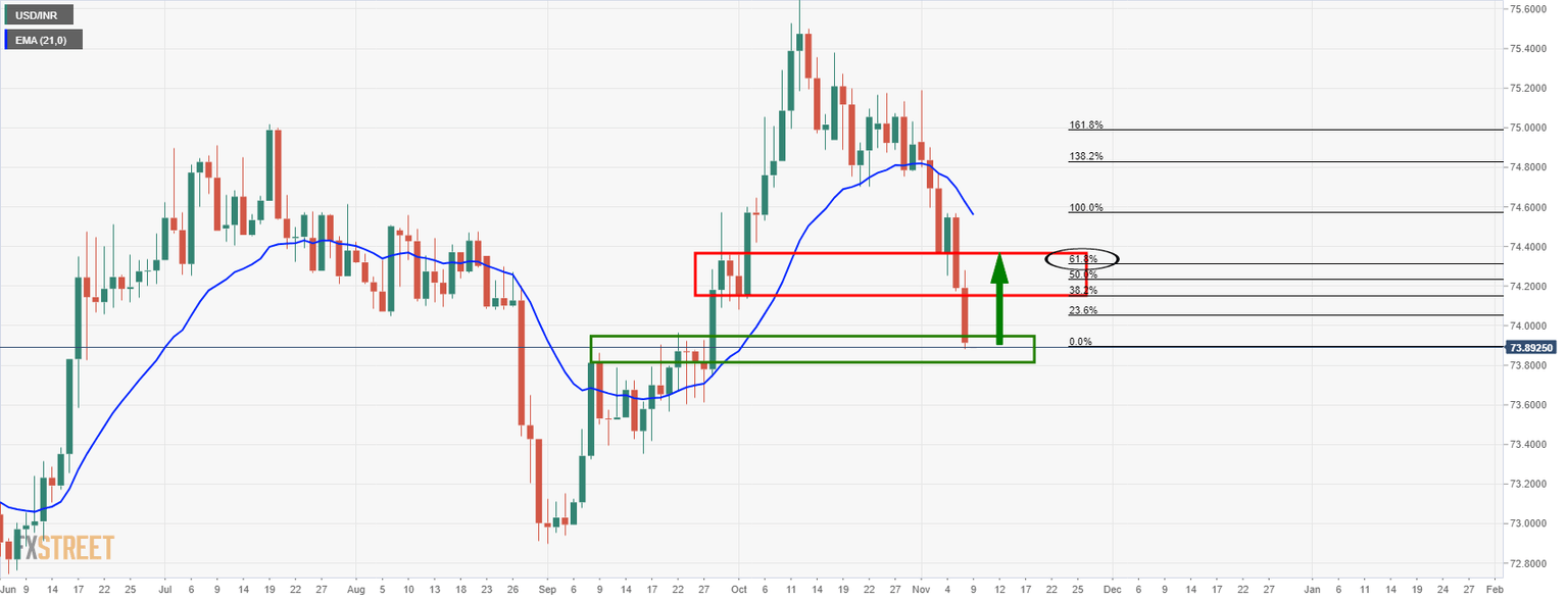 - USD/INR could be in for a bullish correction to test the 61.8% Fibo.