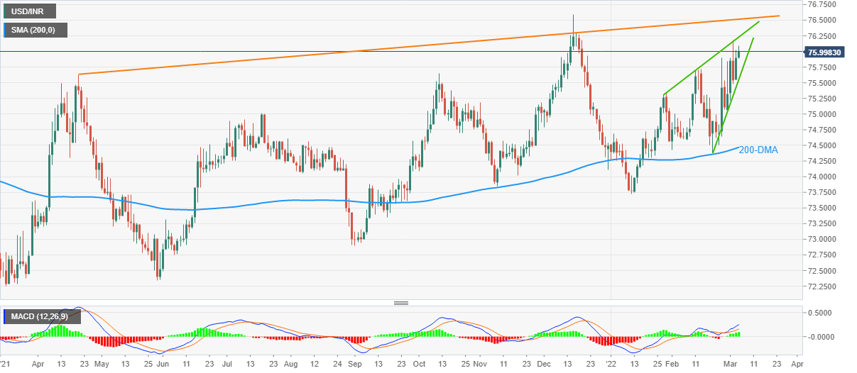 USD/INR holds onto the previous day’s gains as bulls poke multi-day highs marked above 76.00 during early Friday morning in Europe.