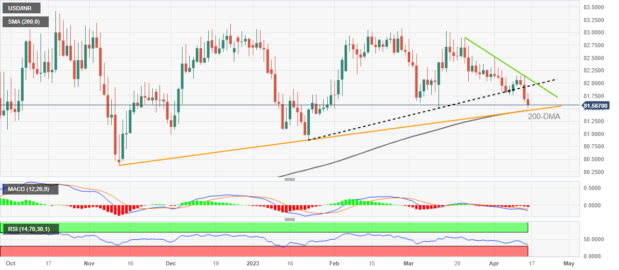 However, the RSI (14) line is approaching the oversold territory and signals bottom picking of the USD/INR prices, which in turn highlights the 81.45 support confluence as the key for the USD/INR bears to watch. That said, the stated level encompasses the 200-DMA and an ascending trend line from November 2022.