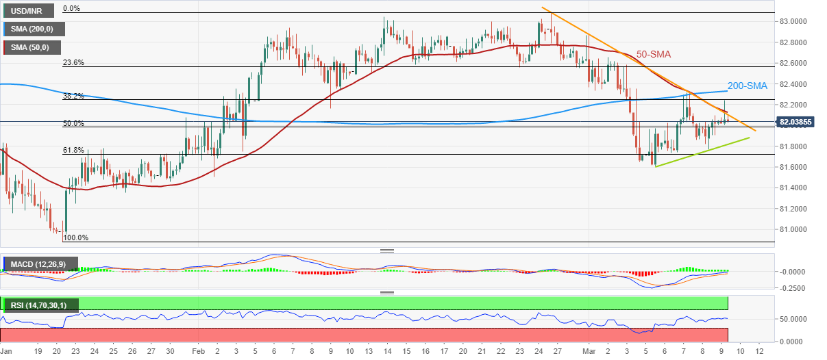 USD/INR struggles to extend the previous day’s recovery moves as it retreats to 82.00 round figure heading into Friday’s European session. In doing so, the Indian Rupee (INR) pair steps back from a convergence of the 50-bar Simple Moving Average (SMA) and a downward-sloping resistance line from February 27.