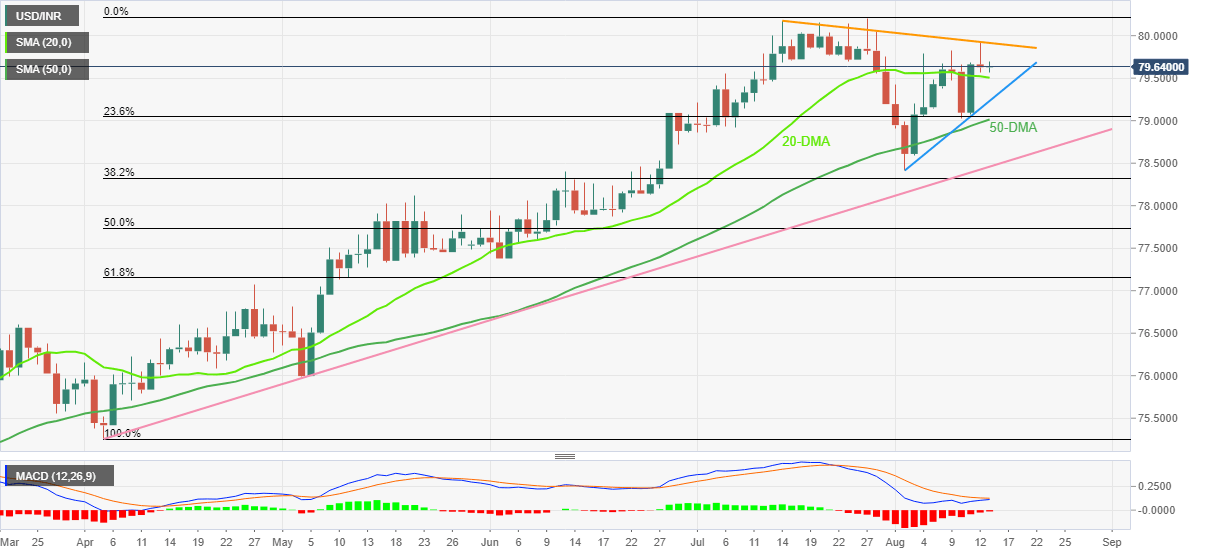 USD/INR extends the previous day’s reversal from a two-week-old hurdle while taking rounds to 79.60-65 during the early Monday morning in Europe. Even so, the 20-DMA defends the Indian rupee (INR) sellers while the looming bull cross on the MACD teases the pair buyers.
