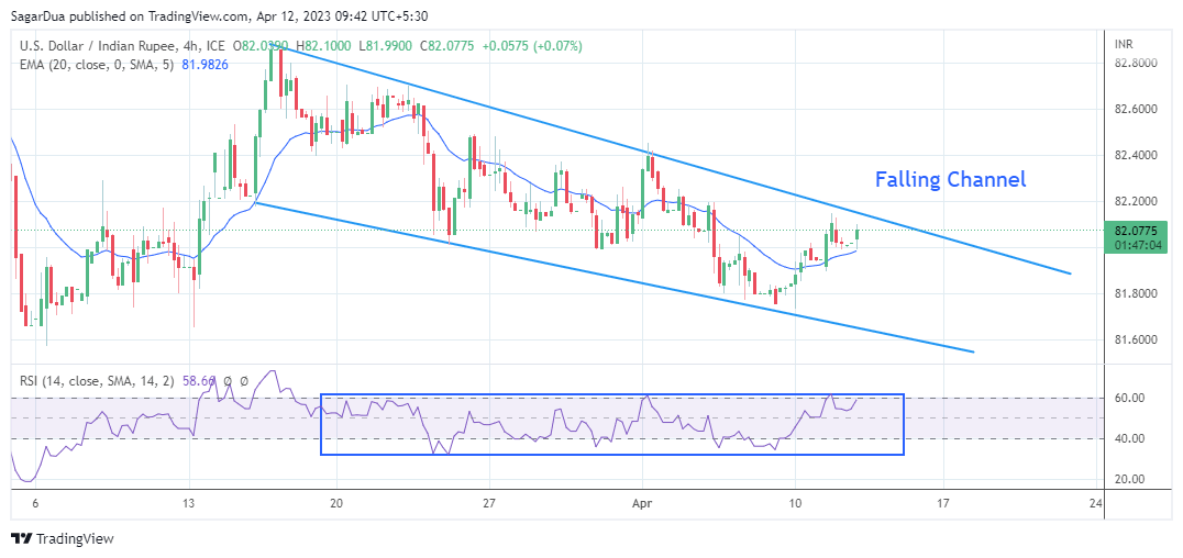 After a firm recovery, USD/INR has reached near the upper portion of the Falling Channel formed on a four-hour scale. Every pullback in the aforementioned chart pattern is considered as buying opportunity for market participants. The 20-period Exponential Moving Average (EMA) at around 82.00 is providing a cushion to the US Dollar bulls.