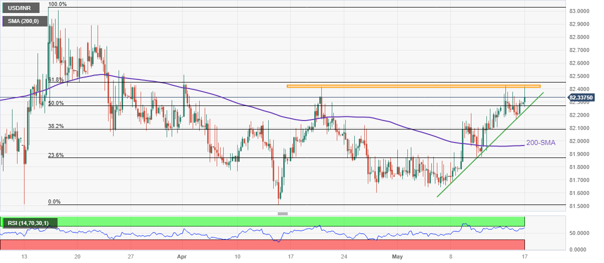 However, the upbeat RSI (14) line, not overbought, favors the extension of the Indian Rupee (INR) pair’s slow grind toward the north triggered earlier in May. With this, the USD/INR pair buyers are hopeful of overcoming the 82.42 resistance zone.