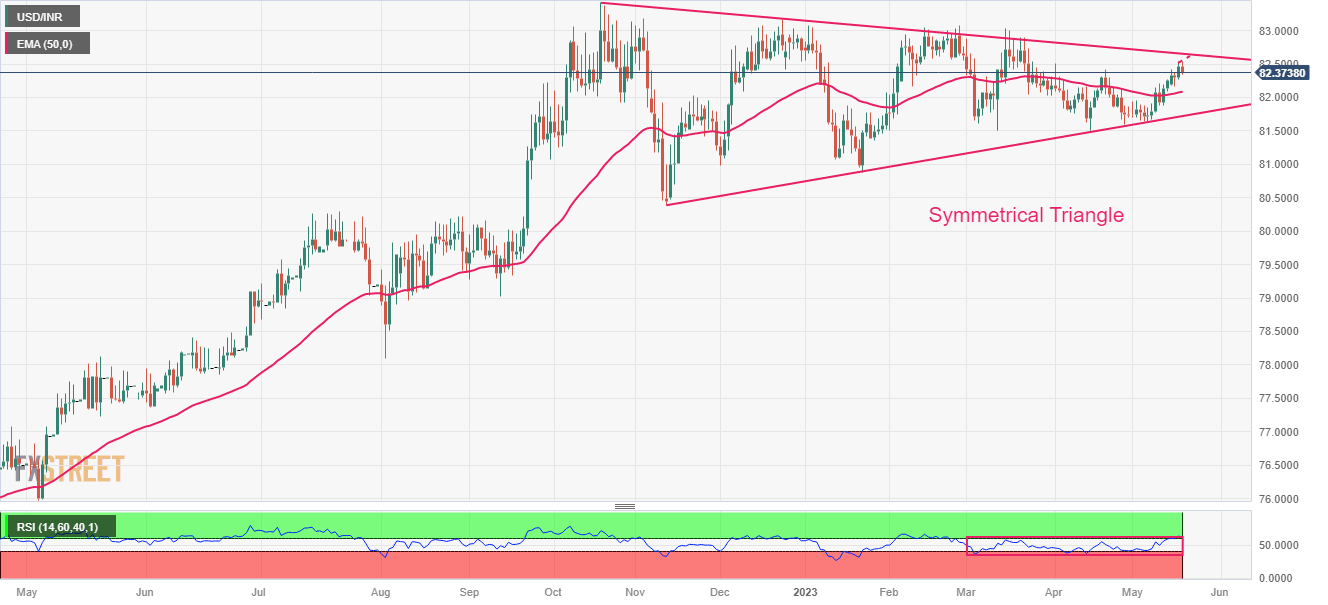 - USD/INR is marching towards the downward-sloping trendline of the Symmetrical Triangle pattern plotted from 83.43.