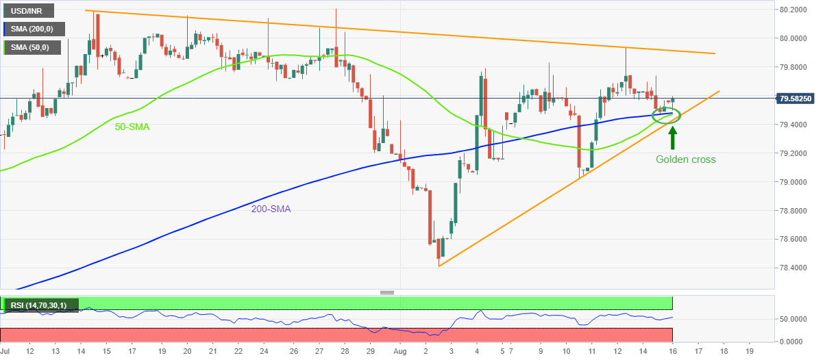 USD/INR picks up bids to pare recent losses around 79.58 during the mid-Asian session on Tuesday. In doing so, the Indian rupee (INR) pair justifies the market’s risk-off mood amid sluggish trading hours, while also respecting the bullish chart pattern.