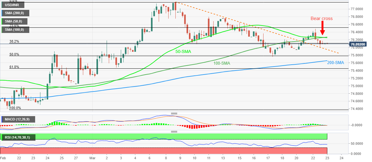 USD/INR Price News: Impending bear cross flags Indian rupee strength around 76.00