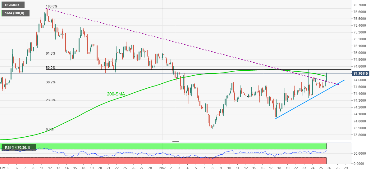 USD/INR Price News: Indian rupee bears pierce key trend line, 200-SMA above 74.50