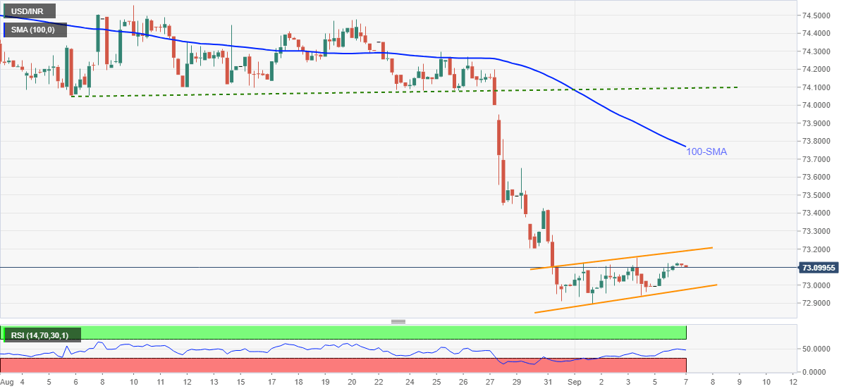 USD/INR retreats to 73.09 after positing the heaviest daily gains in 13 days. That said, the Indian rupee (INR) pair remains inside a bearish chart pattern called bear flag while taking rounds to the three-month low flashed last week.