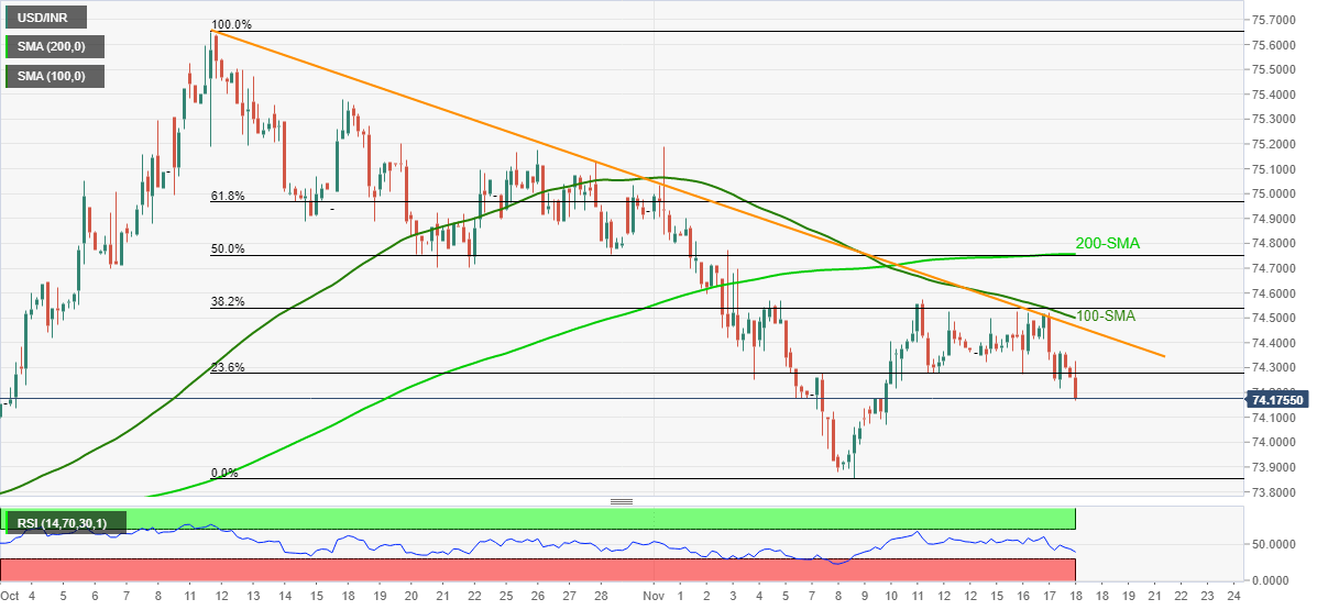 USD/INR stands on slippery grounds towards 74.00, down 0.15% intraday to form weekly bottom around 74.16. In doing so, the Indian rupee pair (INR) drops for the second consecutive day heading into Thursday’s European session.