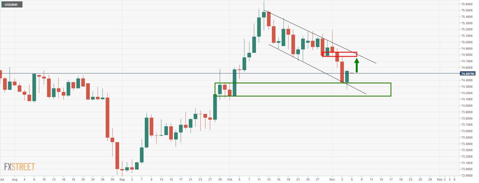 The following illustrates the current trajectory of the Indian rupee vs the greenback and the daily market structure within a bullish flag that still has room to play out and lead to an upside sure in USD/INR.
