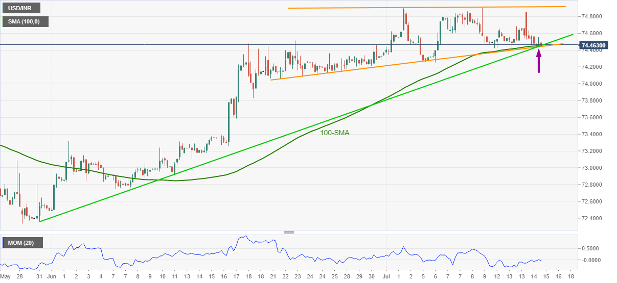 In doing so, the Indian rupee (INR) pair sellers attack the key convergence comprising 100-SMA, lower line of a three-week-old rising wedge bearish formation and an ascending support line from May 31.