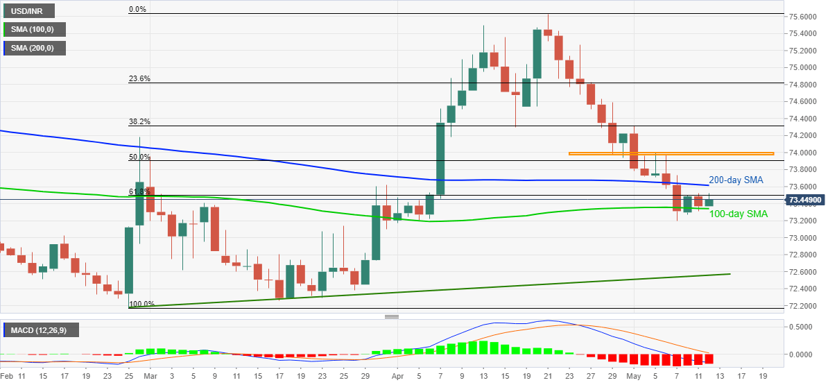 - USD/INR edges higher around 73.46, up 0.11% on a day, amid the initial Indian trading session on Wednesday. In doing so, the Indian rupee (INR) pair remains confined between 200-day and 100-day SMA as buyers battle 61.8% Fibonacci retracement of February-April upside amid bearish MACD.