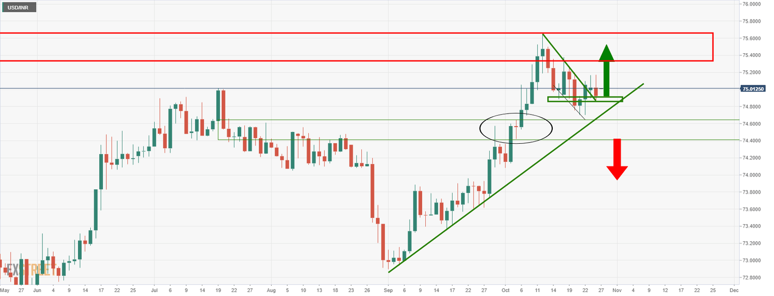 - USD/INR bulls are staying on the sidelines while the US dollar consolidates.