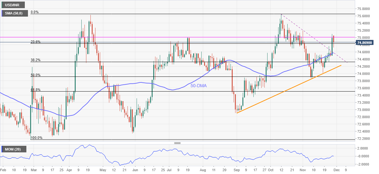 USD/INR remains on the back foot around 74.85, down 0.20% intraday during early Monday morning in Europe. The Indian rupee (INR) pair poked the monthly high the previous day while posting the heaviest daily jump since June 17.