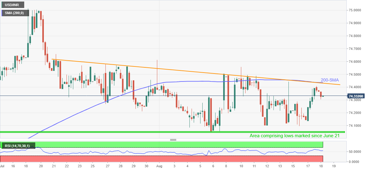 USD/INR drops back to 74.32, reversing the previous day’s up-moves, ahead of Wednesday’s European session. In doing so, the Indian rupee (INR) pair drops 0.06% intraday by printing a U-turn from the key resistance confluence comprising 200-SMA and descending trend line from July 21.