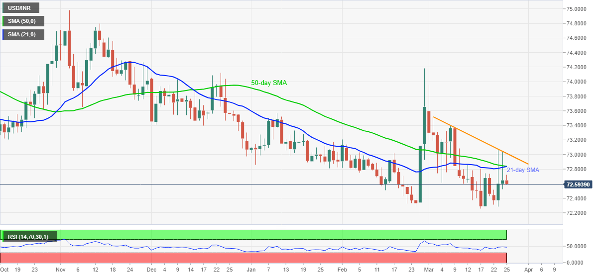 USD/INR extends pullback from 72.20 to around 72.60, down 0.07% intraday, during the initial Indian session on Thursday. In doing so, the quote rejected the previous two-day upside bias while easing below a confluence of 21-day and 50-day SMA.