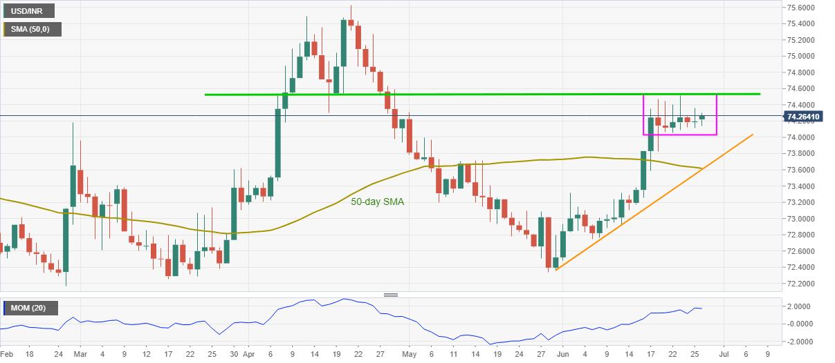 USD/INR eases to 74.23, up 0.06% intraday, amid the initial Indian trading hour on Monday. The Indian rupee (INR) pair has been stuck in a choppy range between 74.00 and 74.55-60 since last week.