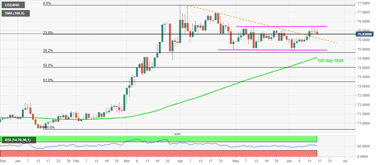 USD/INR declines to 75.83, down 0.15% on the day, during the pre-European session on Tuesday. The quote has been trading in a broad range between 76.22 and 74.95 since early-May. As a result, it’s the latest pullback from the upper limit suggests further declines.