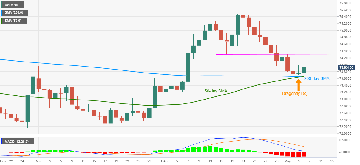 USD/INR Price News: Indian rupee sellers attack 74.00 on Dragonfly Doji near key SMA joint