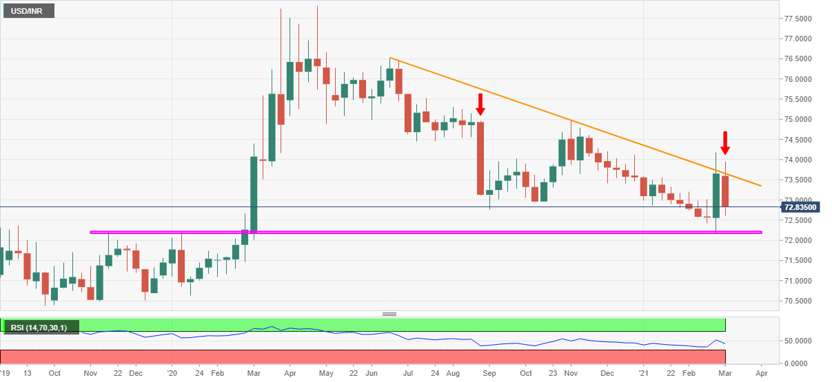 In doing so, the Indian rupee pair reverses the previous week’s heavy gains that refreshed the yearly top, before stepping back from a descending resistance line from June 2020.
