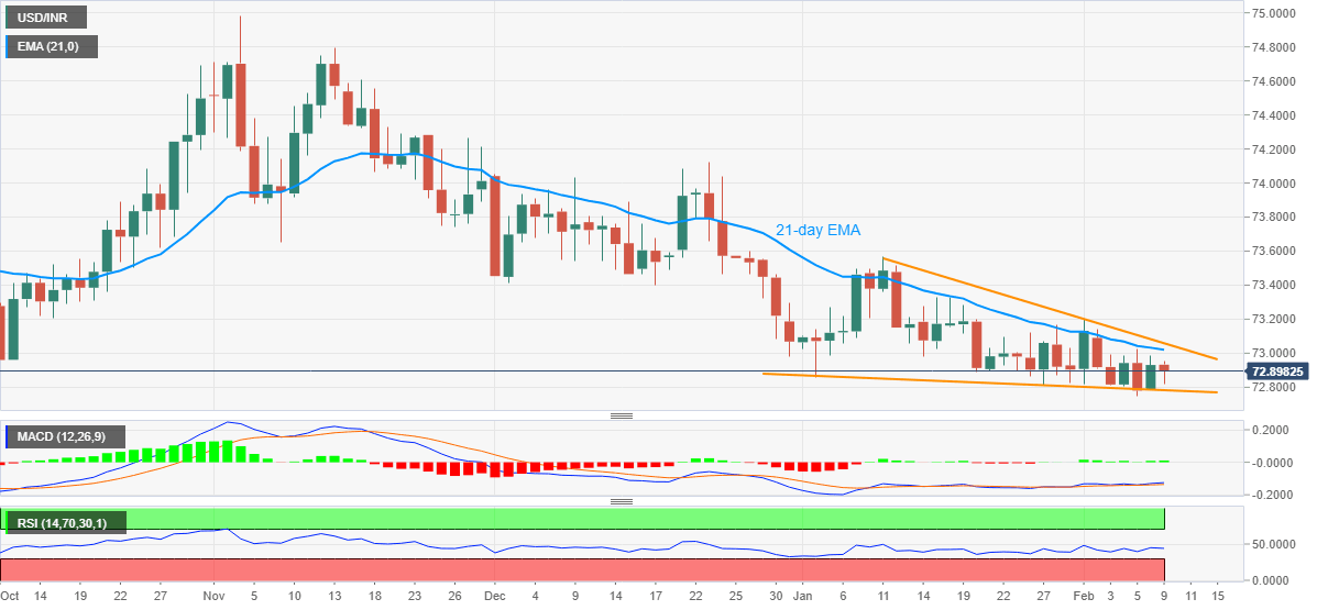 USD/INR rises to 72.89, down 0.10%, during the initial hour of the Indian trading session on Tuesday. In doing so, the quote remains below 21-day EMA and inside short-term bullish chart pattern.