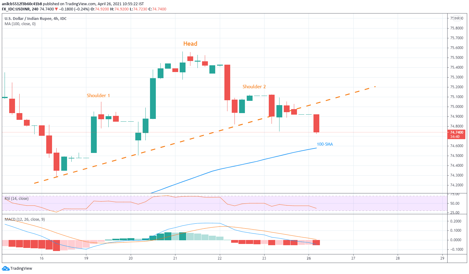 USD/INR holds lower ground near 74.80, down 0.05% intraday, amid an initial Indian session on Monday. The pair recently confirmed a bearish chart pattern, head-and-shoulders (H&S) on the four-hour play.
