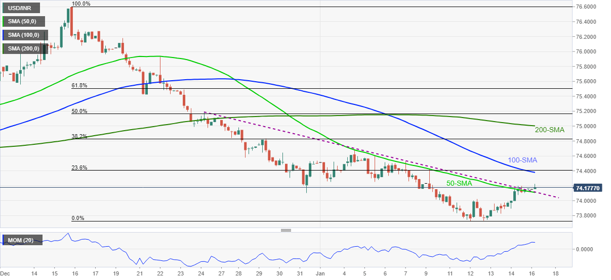 With this, USD/INR bulls eye the 100-SMA level of 74.37 ahead of challenging the monthly peak near 74.70.